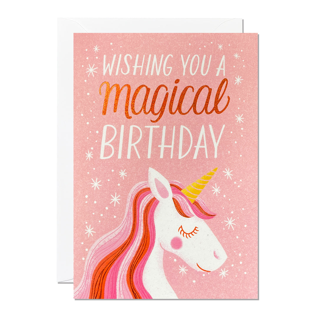 Believe in the magic with this birthday card, featuring a beautiful unicorn, with its gold horn and long locks.